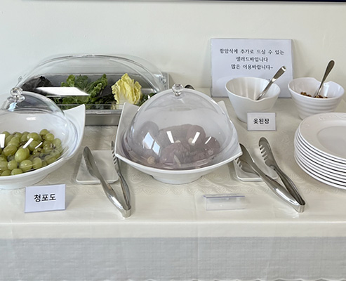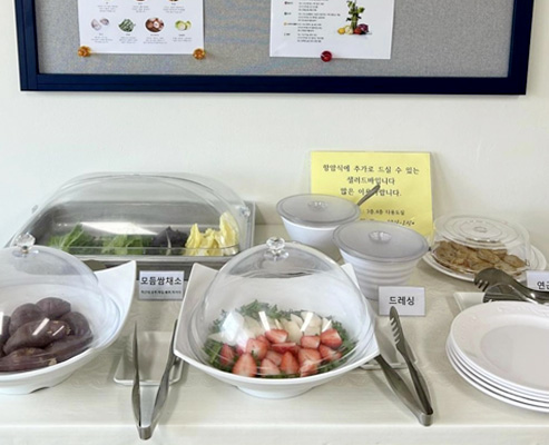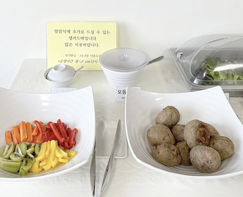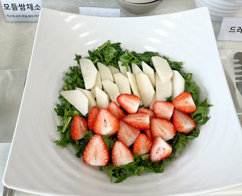 | 가지나물 | 아이스황도 | 파인콘샐러드 | 꼬시래기초무침 | 얼갈이나물 | 청경채나물 | 쌈다시마/초장 | |